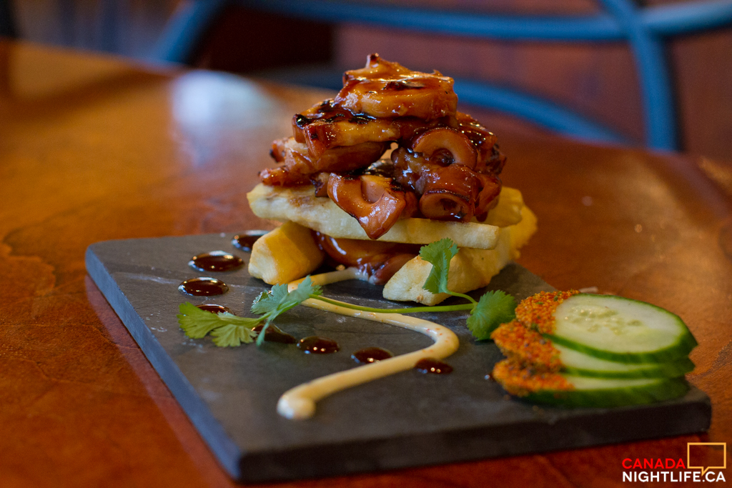 Grilled octopus with a signature BBQ sauce on top of yuca fries. The sweetness in the sauce gives a nice twist to the flavour of the octopus, and it’s served with fries made from a special potato-like substitute.