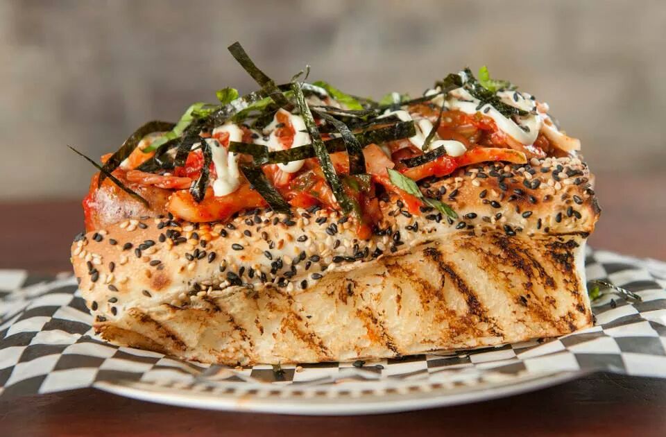 Godfather sausage with Wasabi mayo, kim chi and sliced nori.
